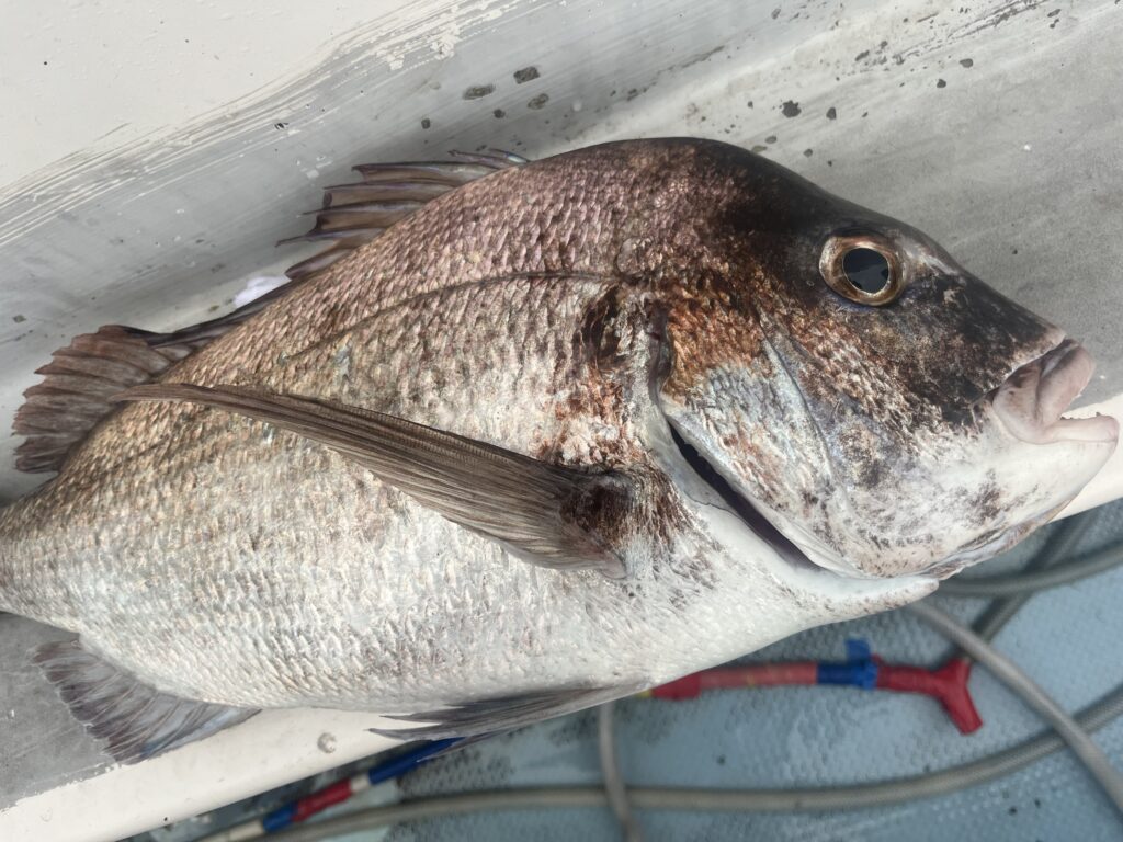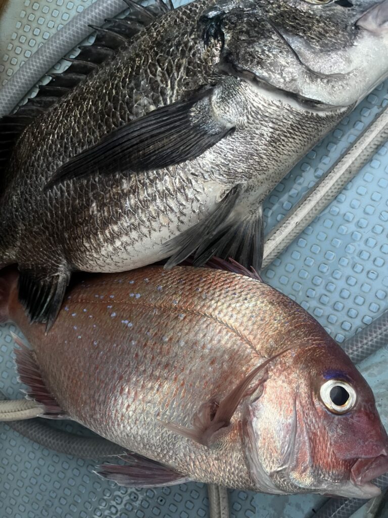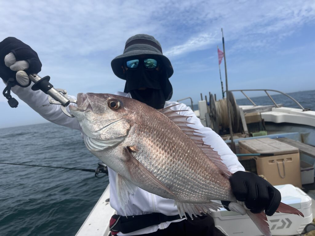 ⬆️前回、釣果無しの手ぶらで帰してしまった桑名の名人さん💦。今日は早々に良型昇り真鯛🎏ゲット❗️。ホッ😌。